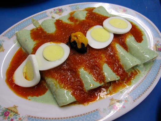 Tacos de huevo duro picadito y cubiertos por salsa de semilla de calabaza o "pepita".