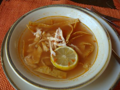Un delicioso caldo de pollo desmenuzado, tostadas y jugo de lima.