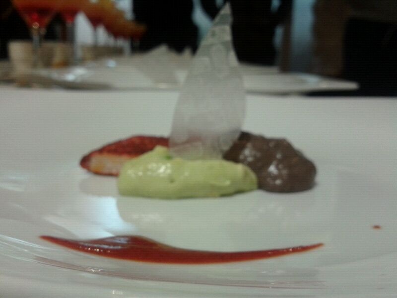 Carne de cerdo marianada en adobo y jugo de naranja, mousse de aguacate, crema de frijol, salsa de adobo y chips de arroz